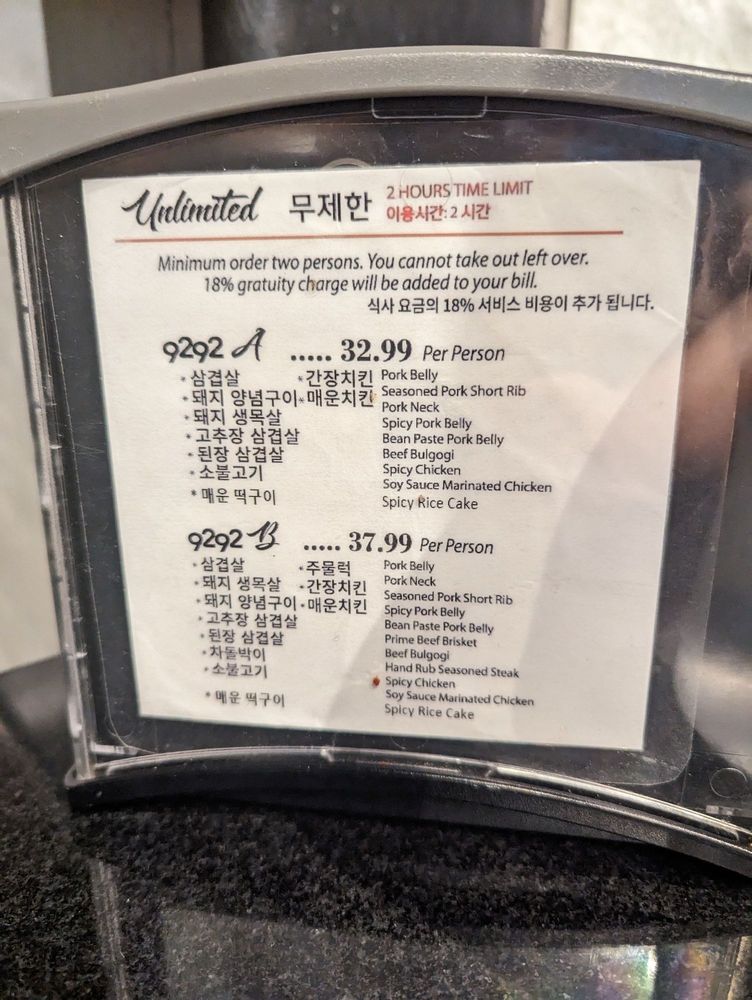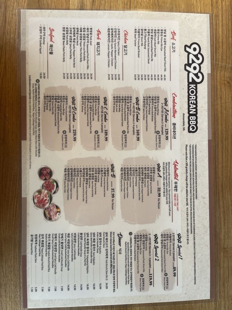 Introducing the menu at 9292 Korean BBQ, located in Annandale, VA, offers a casual and trendy dining experience with great options for Korean BBQ enthusiasts. The menu includes a variety of meat options like prime beef brisket, hand rub season steak, bean paste pork belly, pork short rib, and bulgogi. Customers have raved about the flavorful dishes, generous portions, and attentive service. The restaurant also provides a selection of banchan, including corn cheese and eggs that are regularly replenished. Despite some feedback about the smoky atmosphere and sticky tables, customers appreciate the quick seating, lowkey ambiance, and the option for AYCE (All You Can Eat) BBQ. Overall, 9292 Korean BBQ offers a fun and satisfying dining experience suitable for small groups or larger parties.