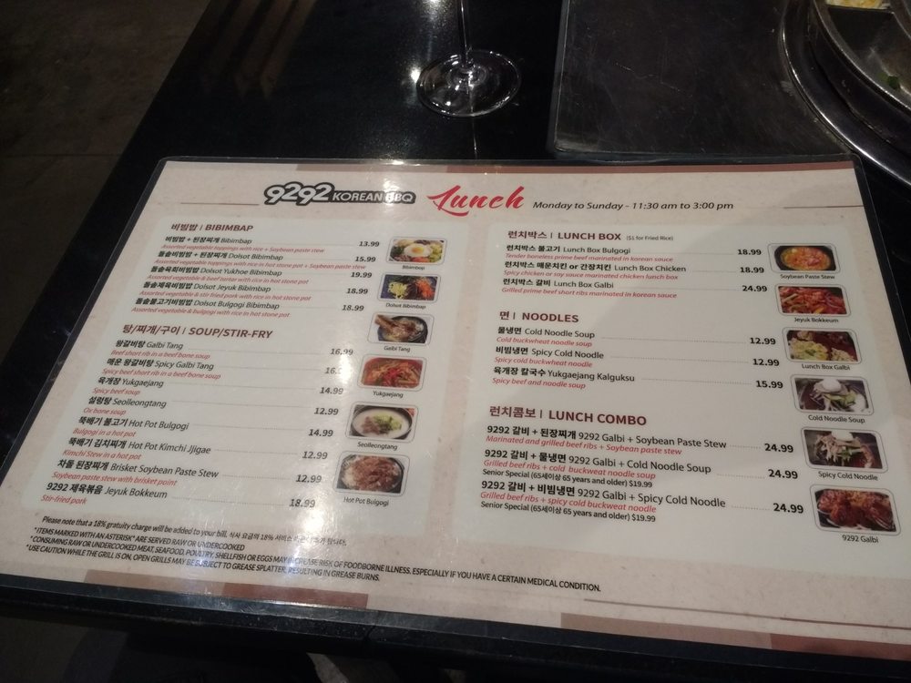 9292 Korean BBQ Menu (Update 2025)